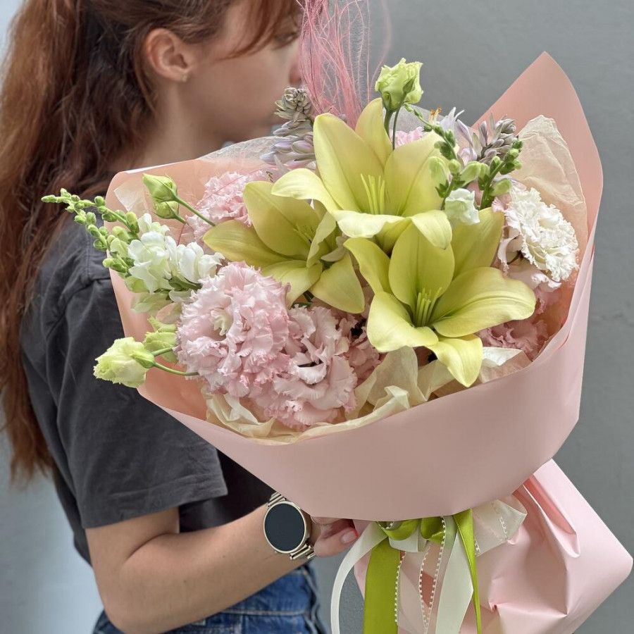 На фото букет «хрустальный луг». В составе: лилия 3 шт, эустома (лизиантус) 4 шт, зелень 3 шт, дизайнерская упаковка 1 шт, атласная лента 1 шт, . Все цветы свежие и ароматные, букет красиво оформлен и отлично подходит для подарка. Доступна доставка цветов или самовывоз.