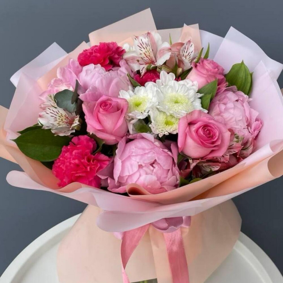 На фото букет «игра нежности». В составе: пион 5 шт, хризантема кустовая 2 шт, роза 5 шт, гвоздика 3 шт, рускус 3 шт, дизайнерская упаковка 1 шт, атласная лента 1 шт, . Все цветы свежие и ароматные, букет красиво оформлен и отлично подходит для подарка. Доступна доставка цветов или самовывоз.