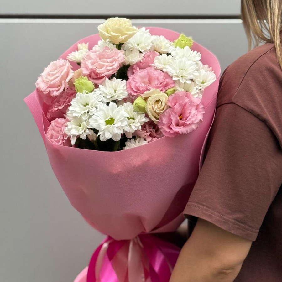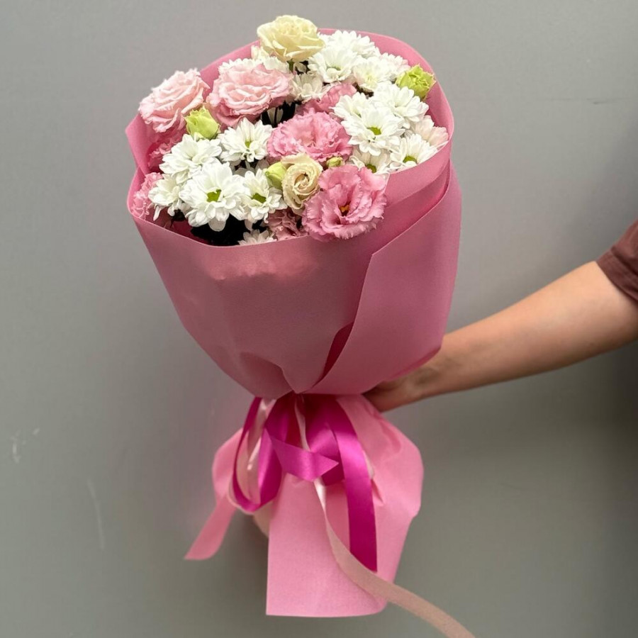 На фото букет «нежность облаков». В составе: хризантема кустовая 3 шт, эустома (лизиантус) 2 шт, дизайнерская упаковка 2 шт, атласная лента 1 шт, . Все цветы свежие и ароматные, букет красиво оформлен и отлично подходит для подарка. Доступна доставка цветов или самовывоз.